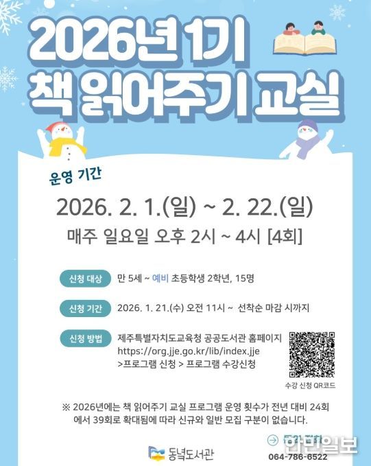한민일보 서울포커스 임경복 기자 | 제주도교육청 동녘도서관은 2월 1일부터 22일까지 평생교육실에서 유아 및 저학년 어린이의 독서 흥미와 창의력 향상을 위한 ‘2026년 1기 책 읽어주기 교실’을 운영한다.
