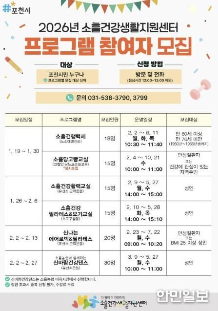 한민일보 서울포커스 심기옥 기자 | 포천시 소흘건강생활지원센터는 시민들의 건강 증진과 활기찬 일상 지원을 위해 오는 19일부터 ‘2026년 상반기 건강증진 프로그램’ 참여자를 모집한다.