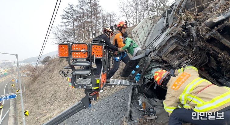 이번 사고는 석탄재를 적재한 덤프트럭이 가드레일을 출동한 뒤 전복된 것으로 확인됐으며, 신고 접수 직후 홍성소방서는 즉시 현장 출동을 했다.
