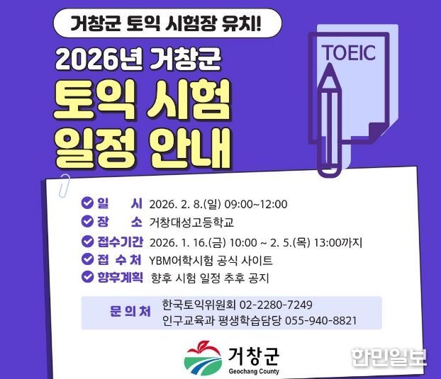 한민일보 서울포커스 김서윤 기자 | 거창군이 토익시험장을 유치하며 교육도시로서의 위상을 한층 강화하고 있다.