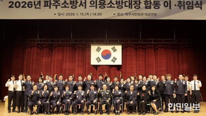 한민일보 서울포커스 진광성 기자 | 파주소방서는 1월 15일 파주시민회관 대공연장에서 『2026년 파주소방서 의용소방대 대장 합동 이·취임식』을 열고, 지역 안전을 위해 헌신해온 이임 대장들의 공로에 감사를 전하는 한편, 새로운 리더들과 함께 ‘의용’의 사명을 이어갈 뜻을 다졌다.