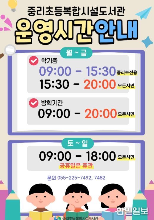 한민일보 서울포커스 김서윤 기자 | 창원특례시 중리초등복합시설도서관은 내서도서관 재건립 장기 휴관으로 인한 불편을 해소하고, 시민들의 도서관 이용 편의를 높이기 위해 2026년 1월 2일부터 평일 저녁 8시까지 도서관 야간 운영을 진행하고 있다고 밝혔다.