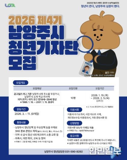 한민일보 서울포커스 김성윤 기자 | 남양주시는 청년들과 소통을 강화하고 시정 참여를 확대하기 위해 1월 15일부터 2월 5일까지 ‘2026년 제4기 청년 기자단’을 모집한다고 밝혔다.