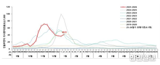 질병관리청에서 운영 중인 표본감시 결과, 의원급 의료기관의 인플루엔자 의사환자 분율은 11월 중순(‘25년 47주차) 이후 감소 추세를 보이다, ’26년 2주차(1.4.~1.10.) 에는 외래환자 1,000명당 40.9명으로 전주(36.4명) 대비 소폭 증가하면서, 이번 절기 유행기준(9.1명)보다 높은 수준으로 유행이 지속되고 있다.