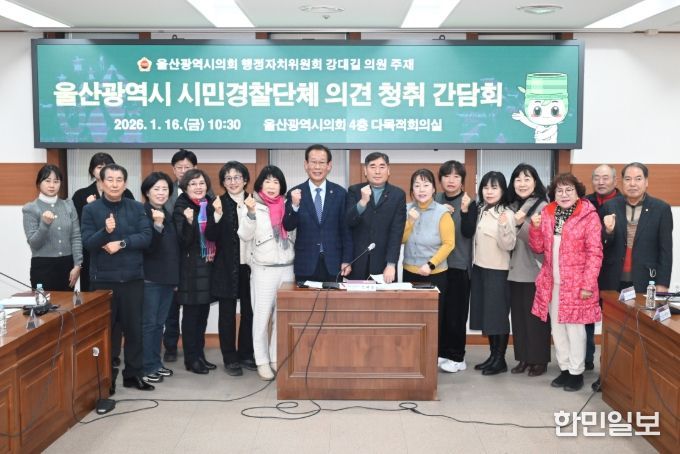 한민일보 서울포커스 임경복 기자 | 울산시의회 강대길 의원은 16일 의회 4층 다목적회의실에서 주민, 시민경찰단체, 경찰위원회ㆍ경찰청 관계 부서 등과 함께 ‘울산광역시 시민경찰단체 의견 청취’ 간담회를 개최했다.
