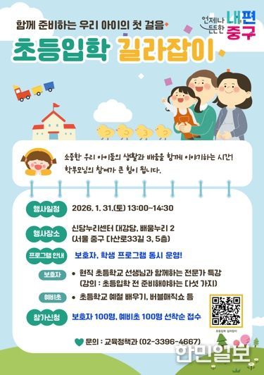 한민일보 서울포커스 김서윤 기자 | 서울 중구가 ‘2026 초등입학 길라잡이’ 설명회를 오는 31일 오후1시부터 신당누리센터 대강당에서 개최한다. 예비 초등학생과 학부모를 대상으로 약 1시간 반 동안 현직 교사가 첫 학교생활에 대한 궁금증을 해소해 줄 예정이다.