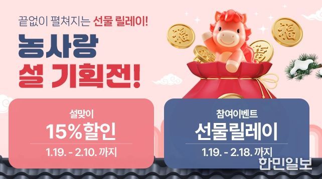 한민일보 서울포커스 임철현 기자 | 충남도 대표 농특산물 온라인 쇼핑몰 충남농사랑이 한 해의 시작을 알리는 설 명절을 맞아 도내 농특산물의 소비 촉진, 지역 농가의 소득 증대와 함께 도민의 합리적이고 건강한 소비를 위해 19일부터 2월 10일까지 설 명절 기획전을 진행한다.