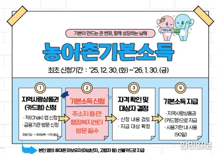 남해군 관계자는 “농어촌 기본소득은 읍·면 행정복지센터 방문 신청이 원칙”이라며 “신청 기간 내 반드시 직접 방문해 신청 절차를 완료해야 최초 지급분을 받을 수 있다”고 말했다.