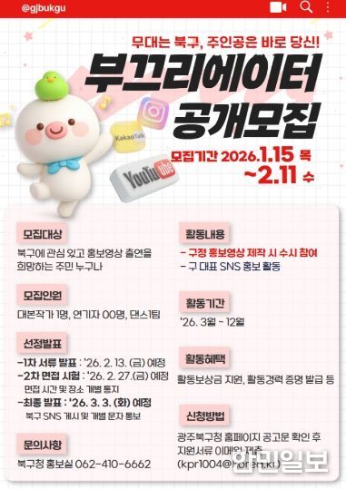 한민일보 서울포커스 임경복 기자 | 광주광역시 북구는 주민이 직접 북구의 소식을 전하는 ‘부끄리에이터’를 모집한다고 19일 밝혔다.