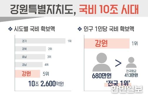 한민일보 서울포커스 곽중희 기자 | 강원특별자치도는 국비 확보 10조 시대에 진입한 가운데, 인구 1인당 국비 확보액이 약 680만 원으로 전국 1위에 해당한다고 밝혔다.