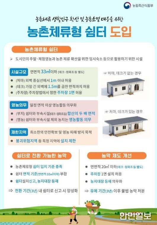 농촌체류형 쉼터는 농지 내 총면적 33㎡ 이내에서 설치할 수 있으며, 주차공간과 데크, 정화조 등 부대시설 설치가 가능하다.
