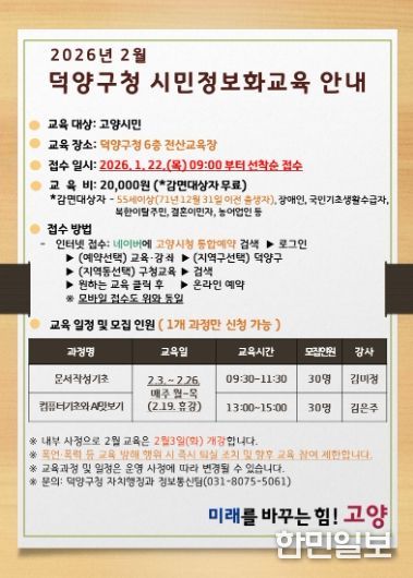 한민일보 서울포커스 김은금 기자 | 고양특례시 덕양구는 고양시민의 디지털 역량 강화를 위해 ‘2026년 제1차 덕양구 시민정보화교육’ 수강생을 오는 22일부터 모집한다고 밝혔다.