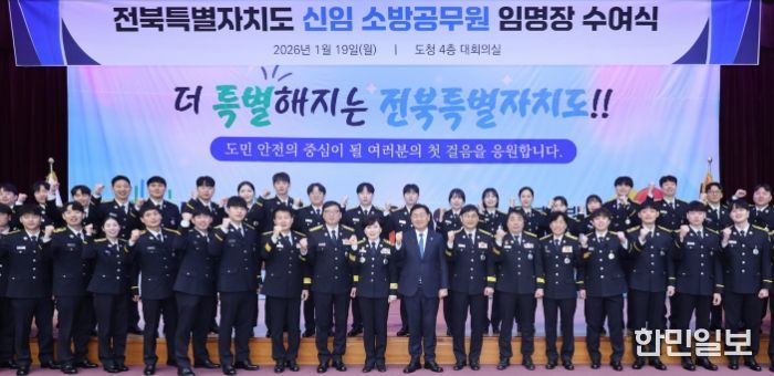 한민일보 서울포커스 최성훈 기자 | 전북특별자치도는 19일 도청 4층 대회의실에서 2026년 신임 소방공무원 임명장 수여식을 열고, 도민의 생명과 안전을 지킬 신임 소방공무원 45명을 공식 임명했다.