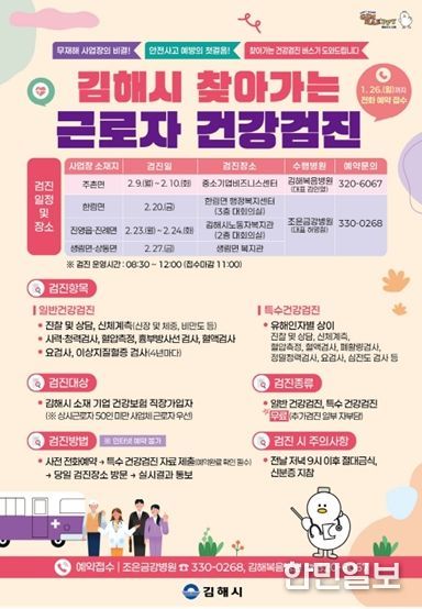 순회 검진 일정을 보면 ▲주촌면(2.9~10 중소기업비즈니스센터) ▲한림면(2.20 한림면행정복지센터) ▲진영읍·진례면(2.23~24 김해시노동자복지관) ▲생림면·상동면(2.27 생림면 복지관) 순이다. 검진 시간은 오전 8시 30분부터 낮 12시까지이다.