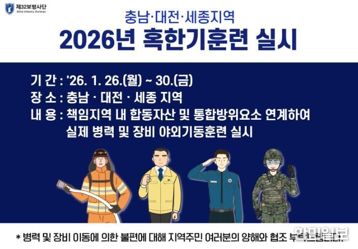 한민일보 서울포커스 유돈상 기자 | 육군 제32보병사단은 오는 1월 26일부터 30일까지 충남ㆍ대전ㆍ세종 지역에서 동계 통합 방위 작전 확립을 위한 혹한기 훈련을 진행한다.