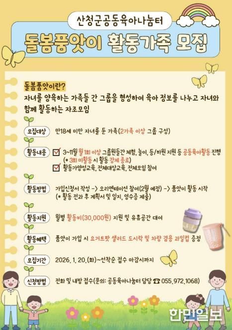 한민일보 서울포커스 김은금 기자 | 산청군가족센터는 20일 공동육아나눔터 운영 일환으로 돌봄품앗이 활동 가족을 모집한다고 밝혔다.