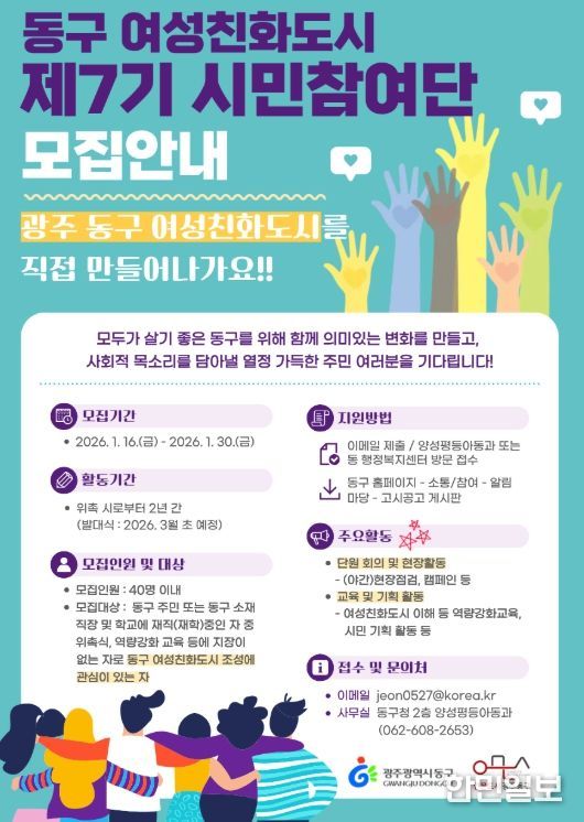 한민일보 서울포커스 임경복 기자 | 광주 동구는 주민이 직접 참여해 여성친화도시 정책을 만들어가는 ‘제7기 동구 여성친화도시 시민참여단’을 이달 30일까지 모집한다고 밝혔다.