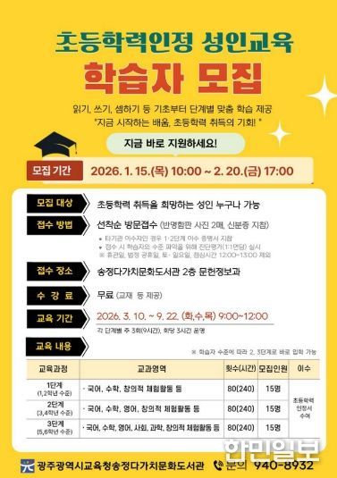 한민일보 서울포커스 임경복 기자 | 광주시교육청송정다가치문화도서관은 ‘2026학년도 초등학력인정 성인교육’ 프로그램을 운영한다.