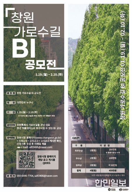 시상은 총 4명(팀)을 선정해 최우수상 1명(팀) 200만 원(창원시장상 포함), 우수상 1명(팀) 100만 원, 장려상 2명(팀) 각 50만 원을 수여할 예정이다. 참여를 희망하는 자는 창원시청 홈페이지 고시공고를 확인해 신청 서류와 원본 파일을 해당 메일로 제출해야 한다.