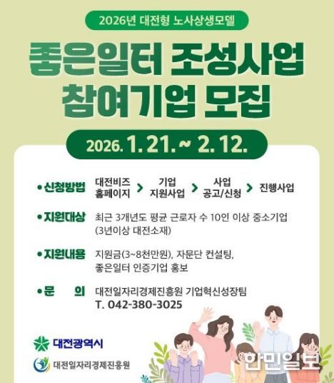 한민일보 서울포커스 김서윤 기자 | 대전시는 1월 21일부터 2월 12일까지 대전형 노사상생 모델‘2026년 좋은 일터 조성사업’에 참여할 12개 기업을 공개 모집한다.