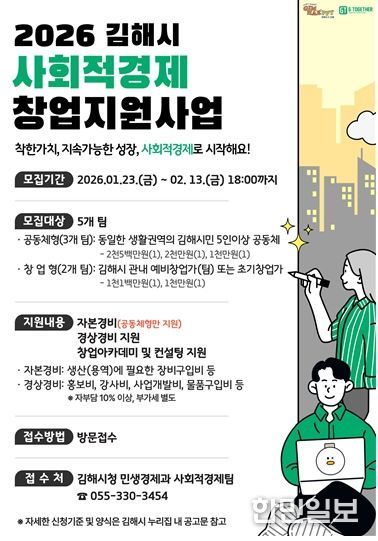 한민일보 서울포커스 김은금 기자 | 김해시는 오는 23일부터 2월 13일까지 2026년 사회적경제 창업 지원사업 에 참여할 팀을 모집한다.