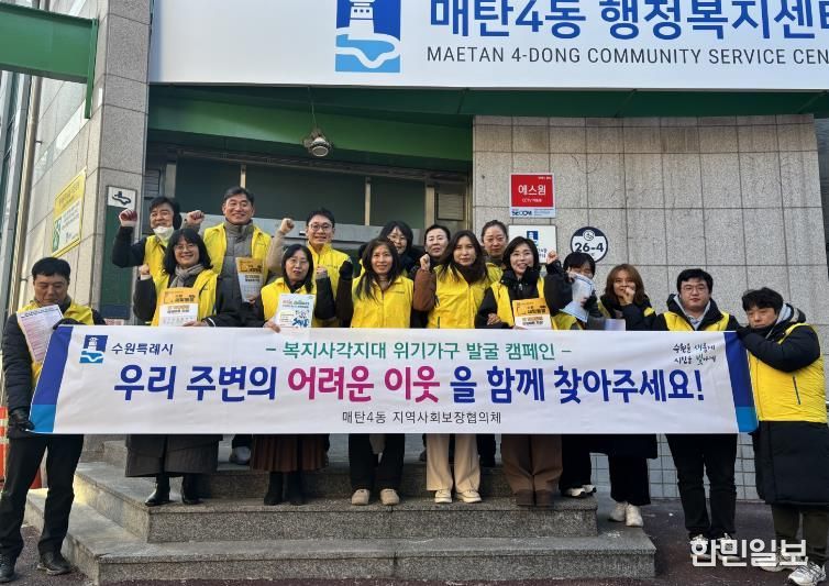 오미숙 매탄4동장은 “매탄4동 행정복지센터는 앞으로도 지속적인 위기가구 발굴 활동을 통해 동절기 복지 안전망 구축에 힘쓰겠다”며 “추운 날씨에도 캠페인에 적극 참여해 주신 지역사회보장협의체 위원님들께 감사드린다”고 밝혔다.