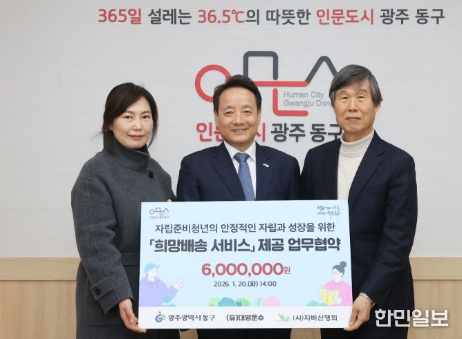 한민일보 서울포커스 임경복 기자 | 광주 동구는 지난 20일 (유)대영운수(대표 김정진), (사)자비신행회와 함께 자립 준비청년의 안정적인 사회 정착을 돕기 위한 ‘희망배송 서비스’ 업무협약을 체결했다고 밝혔다.