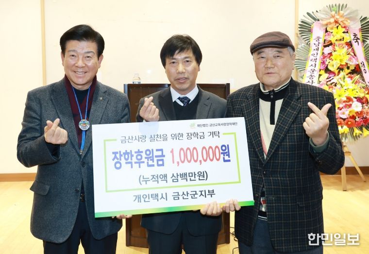 박범인 금산군수는 “지역 경제가 어려운 상황에서도 따뜻한 마음을 전해주신 개인택시 금산군지부에 감사드린다”며 “기부금은 학생들의 학업 지원과 장학사업에 소중히 사용해 학생들이 더 큰 꿈을 펼칠 수 있도록 돕겠다”고 전했다.