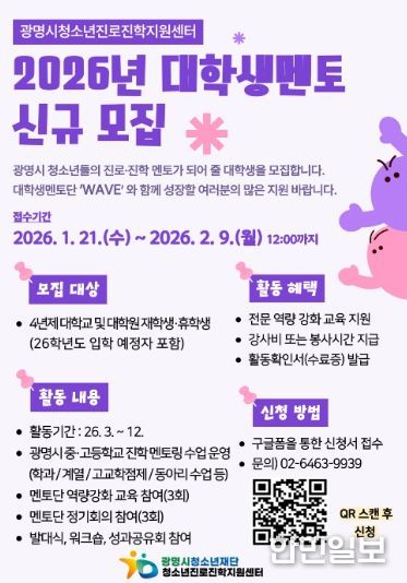 한민일보 서울포커스 임광현 기자 | 광명시청소년재단 청소년진로진학지원센터는 관내 중·고등학교 청소년 대상 학과 멘토링 운영을 위해 ‘2026년 대학생 멘토단(wave)’을 모집한다고 밝혔다.