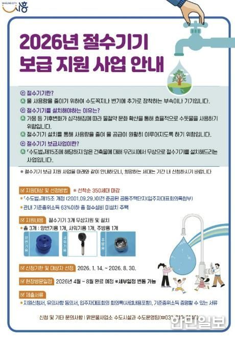 한민일보 서울포커스 유현민 기자 | 시흥시는 물 절약 문화를 확산하기 위해 ‘2026년 절수기기 보급 지원사업’을 본격적으로 추진한다. 올해는 작년보다 지원 대상을 넓혀 관내 저소득 취약계층까지 총 350세대에 가구당 절수기기 3종(양변기용ㆍ주방용ㆍ샤워기용)을 무상으로 지원한다.
