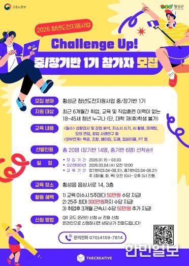 한민일보 서울포커스 진광성 기자 | 횡성군은 지역 청년들의 사회 진출과 성장을 지원하기 위해 ‘2026 청년도전지원사업’ 참여자를 모집한다고 밝혔다.