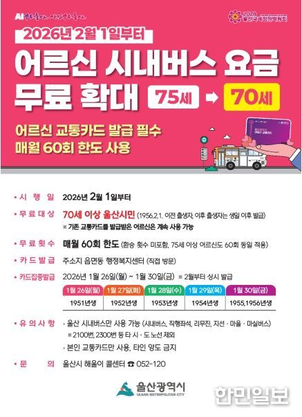 울산시 관계자는 “2024년 9월 어린이 버스요금 무료화와 지난해 7월 75세 이상 어르신 무료화에 이어 이번 70세 이상 무료 확대와 케이(K)-패스를 기반으로 혜택을 확대한 울산형 유(U)-패스 도입 등 시민의 교통비 부담을 덜기 위한 맞춤형 정책을 지속적으로 펼치고 있다”라며 “앞으로도 대중교통 이용 활성화를 위한 다양한 시책을 통해 시민의 삶의 질을 높여 나가겠다”고 말했다.