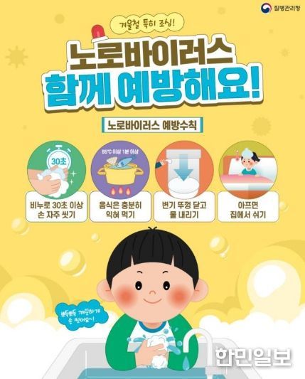 아울러 환자 발생 시에는 ▲증상 소실 후 48시간이 경과할 때까지 등원·등교·출근 제한 ▲배변 후 변기 뚜껑을 닫고 물 내리기 ▲구토물 및 접촉환경, 사용 물품 등에 염소 소독(락스1: 물39) 실시 등 감염 확산 방지를 위한 조치를 반드시 이행해야 한다.