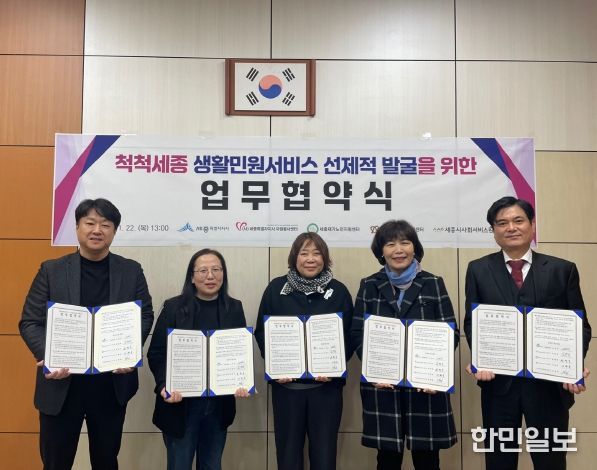 한민일보 서울포커스 김윤이 기자 | 세종특별자치시가 22일 조치원청사에서 ‘척척세종 생활민원기동처리반’과 노인돌봄수행기관 3곳, 세종시자원봉사센터가 노인복지 사각지대 해소를 위한 업무협약을 체결했다고 밝혔다.