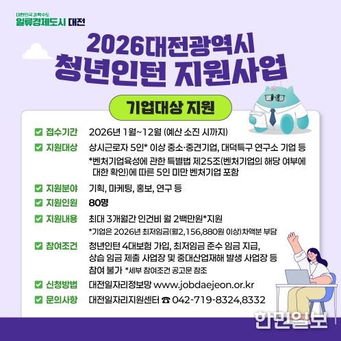 한민일보 서울포커스 유한희 기자 | 대전시는 2026년 청년인턴 지원사업에 참여할 구인 기업과 구직 청년 80명을 27일부터 공개 모집한다.