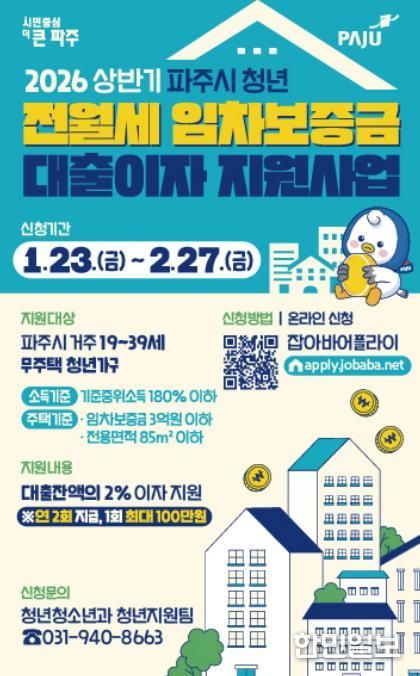 ‘청년 전월세 임차보증금 대출이자 지원’은 파주시에 주민등록을 둔 무주택 가구 중 제1금융권에서 전월세 보증금 대출을 받은 19~39세 청년에게 대출 잔액의 2% 이자(연 최대 200만 원)를 지원하는 사업으로, 상·하반기 각 10가구를 선정해 최대 100만 원씩 반기별로 총 2회 지급한다.