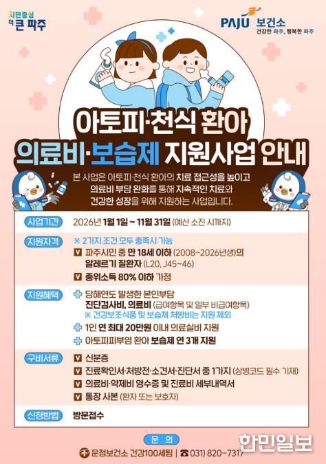 한민일보 서울포커스 진광성 기자 | 파주시 운정보건소는 아토피피부염과 천식 등 알레르기질환을 앓고 있는 환아의 건강한 성장과 보호자의 의료비 부담 완화를 위해 ‘아토피·천식 환아 지원사업’을 연중 운영하고 있다.