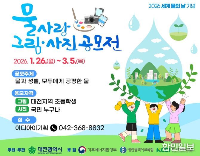 한민일보 서울포커스 유한희 기자 | 대전시는 ‘세계 물의 날(3월 22일)’을 맞아 물 환경에 대한 관심을 높이고 수자원의 중요성을 알리기 위해 ‘물사랑 그림․사진 공모전’을 개최한다.