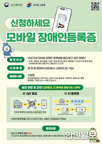 IC칩이 탑재된 신규 장애인등록증 소지자는 ‘대한민국 모바일 신분증’ 애플리케이션을 통해 스마트폰 태깅 방식으로 간편하게 등록할 수 있으나, 기존 실물 장애인등록증 소지자는 가까운 읍·면·동 행정복지센터를 방문해 정보인식부호(QR코드) 인증 절차를 거쳐야 발급받을 수 있다.