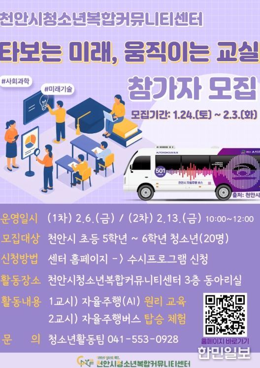 한민일보 서울포커스 황준형 기자 | (재)천안시청소년재단 천안시청소년복합커뮤니티센터가 겨울방학을 맞아 자율주행버스를 직접 타보고 미래 기술을 배우는 ‘타보는 미래, 움직이는 교실’ 참가자를 모집한다고 26일 밝혔다.