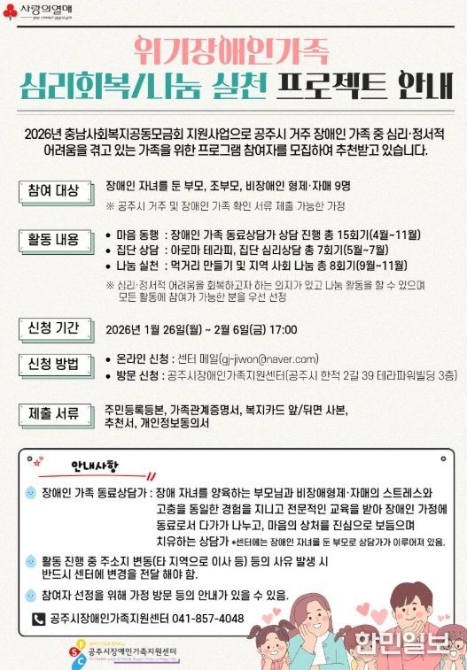 한민일보 서울포커스 임경복 기자 | 공주시 장애인가족지원센터는 2026년 충남사회복지공동모금회 지원을 받아 ‘위기 장애인가족 심리회복 및 나눔 실천 프로젝트’ 참여자를 모집한다고 26일 밝혔다.
