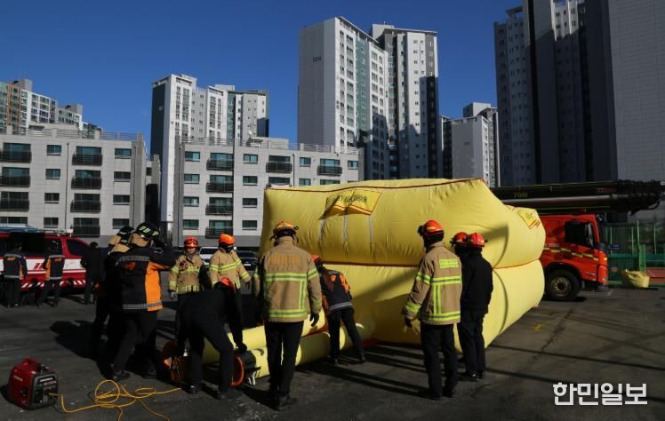 한민일보 서울포커스 최성훈 기자 | 서산소방서는 고층건물 화재 및 추락 위험 상황에 대비해 공기안전매트 신속 설치‧운용 훈련을 실시했다.