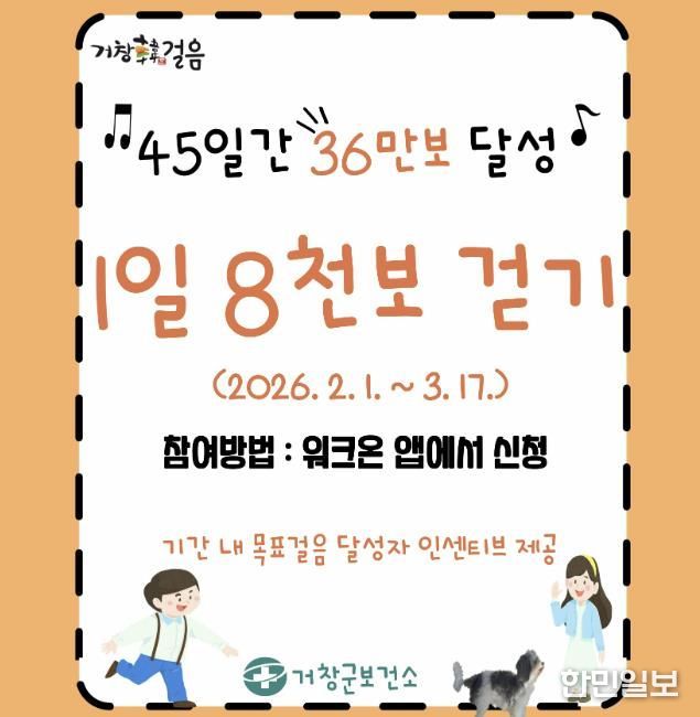 한민일보 서울포커스 김서윤 기자 | 거창군은 오는 2월 1일부터 3월 17일까지 거창군민을 대상으로 신체활동 증진과 생활 속 걷기 실천 활성화를 위해 '거창韓걸음'1차 챌린지를 운영한다.