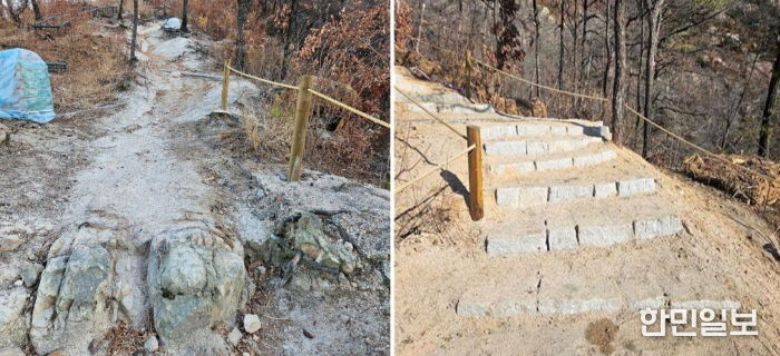 토사 침식이 우려되는 곳과 급경사 암반 지역 등 200m 구간에 폭 2m의 돌계단과 안전난간 및 손잡이를 설치해 등산 보행 안전성을 크게 높였다.