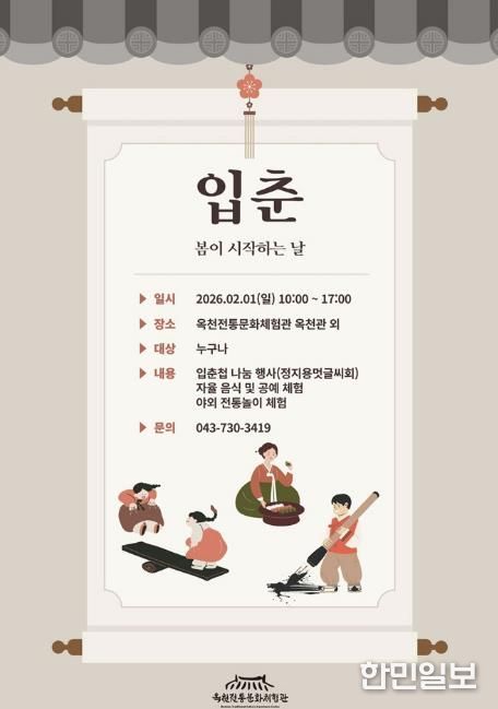 한민일보 서울포커스 김다남 기자 | 옥천전통문화체험관은 우리 고유의 전통 세시풍속인 입춘(立春, 양력 2월 4일경)을 맞아 오는 2월 1일(일) ‘입춘 맞이 행사’를 개최한다.