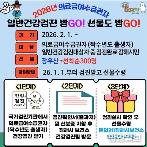 한민일보 서울포커스 김은금 기자 | 김해시보건소는 2026년 새해를 맞아 의료 취약계층의 질병을 조기에 발견하고 예방하기 위해 의료급여수급권자를 대상으로 『일반건강검진 받GO! 선물도 받GO!』 이벤트를 실시한다고 밝혔다.