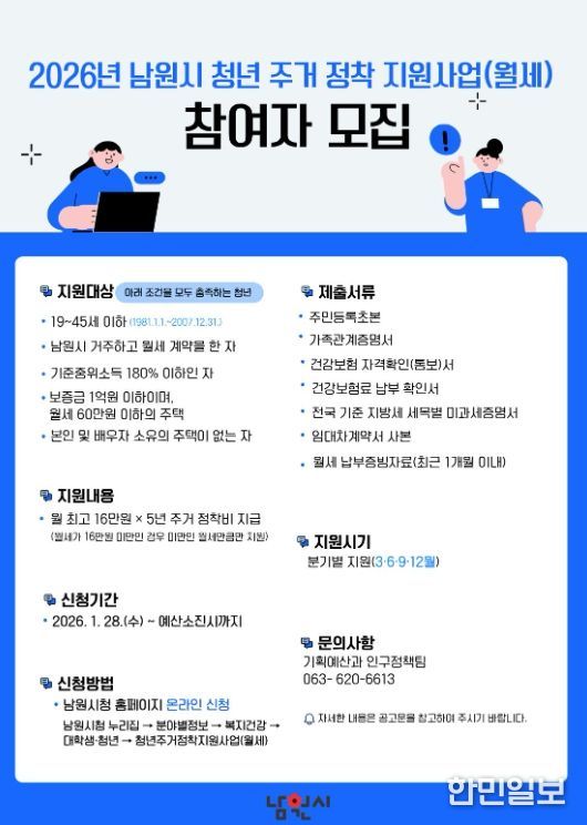 세부 사항은 남원시 누리집을 참고하거나 기획예산과 인구정책팀(☎063-620-6613)으로 문의하면 된다.