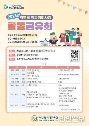 한민일보 서울포커스 임광현 기자 | 부산광역시교육청은 다음달 4일 오후 부산진구 양정동 교육연구정보원 대강당에서 ‘학부모 학교참여사업 활동공유회’를 개최한다.