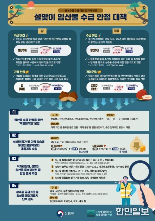 한민일보 서울포커스 임경복 기자 | 산림청은 설 명절을 대비해 대표 임산물인 밤과 대추의 공급에 차질이 없도록 설 연휴 전날인 2월 13일까지 ‘설 성수품(임산물) 수급 안정 대책반’을 운영한다고 29일 밝혔다.