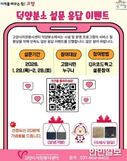한민일보 서울포커스 김은금 기자 | 고양시자원봉사센터 덕양분소가 시설과 운영 프로그램의 서비스 질 향상을 위해 고양시민과 자원봉사자 대상 만족도 조사를 실시한다고 밝혔다.
